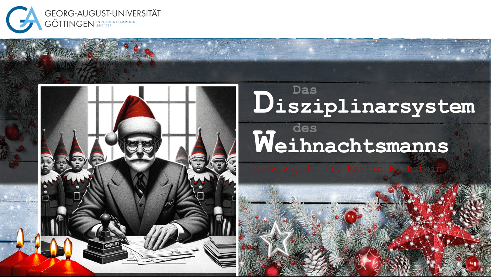 Auf Einladung der Fachgruppe Politikwissenschaften hielt ich an der Universität Göttingen am 5.12.2023 eine fröhliche und irgendwie auch etwas lehrreiche Weihnachtsvorlesung unter dem vielsagenden Titel „Das Disziplinierungssystem des Weihnachtsmanns“.