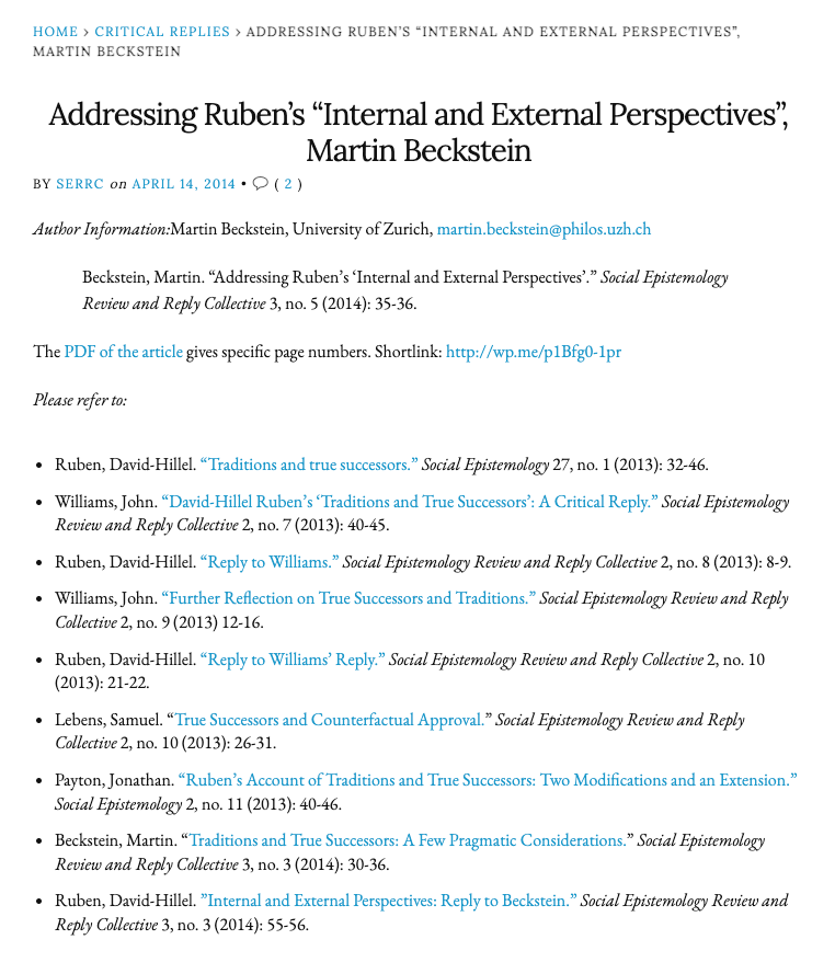 In his reply, David-Hillel Ruben argues that “internal perspectives” on disputes over true succession (i.e. of the parties involved) might well rely on counterfactuals, but that “external perspectives” (i.e. of scholars) ought to dispense with them because they are hard to verify. I think Ruben is right in this regard. Moreover, I do not wish to object to his overall argument that social disputes over true succession are intractable because true succession is inherently vague. However, I still tend to consider Ruben’s account incomplete because the category of vagueness alone does not fully explain why disputes over true succession are essentially contestable.